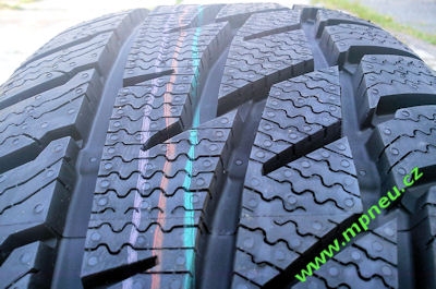 Samotný záběr na sněhu a zajišťuje hustá siť cik cak lamelek, které jsou velice pěkně, čistě, nenáročeně řešené, mají oblý tvar, takže se nebudou obrušovat na suché vozovce, ale přitom mají pravidelnou geometrii sklonu, podle úhlu sklopení dezénového bloku. Jednoduché čisté řešení, které je osvědčné a kterému se rozhodně nedá nic vytknout. Ještě se trochu vrátím k tvaru dezénových bloků. Je tam ještě jedna trochu skrytá výhoda uložení dezénových bloků do párů. Tou výhodou je jízdní komfort. Protože pneumatika při odvalování vydává zvuk, tak pokud je dezén po celém obvodu stejný, tak může docházet k vnitřní hlučnosti uvnitř vozidla. To je u Matadoru potlačeno právě různých tvarem dezénového bloku v horní a spodní části, kdy tvar narušuje zvukový tok a rozmělňuje ho. Pneumatika tak bude určitě velmi komfortní, protože toto řešení se osvědčilo u mnoha jiných pneumatik.