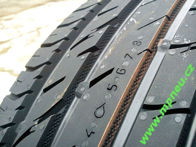 Další novinka je hned na vnitřním rameni pneumatiky. Na přední stěně krajního vnitřního dezénového bloku je patrná drobná eliptická štěrbinka. To je tzv. Přepadová drážka (obr. níže, zelená elipsa, označuje místo drážky), která má za úkol zadržovat vodu, když objem příčným drážek narůstá. Příčné drářžky jsou rovné úzké drážky na tomto bloku. Tyto drážky se na mokré vozovce otevírají a pomáhají odvádět vodu. Přepadová drážka to má za úkol ještě více jistit a skladovat přebytečnou vodu, pokud je vody tolik, že nestíhá odtékat z dezénu. Tyto funkce dohromady mají za následek opravdu vynikající odvod vody vůči aquaplaningu. Tyto přepadové drážky jsou i na vnějším rameni.
